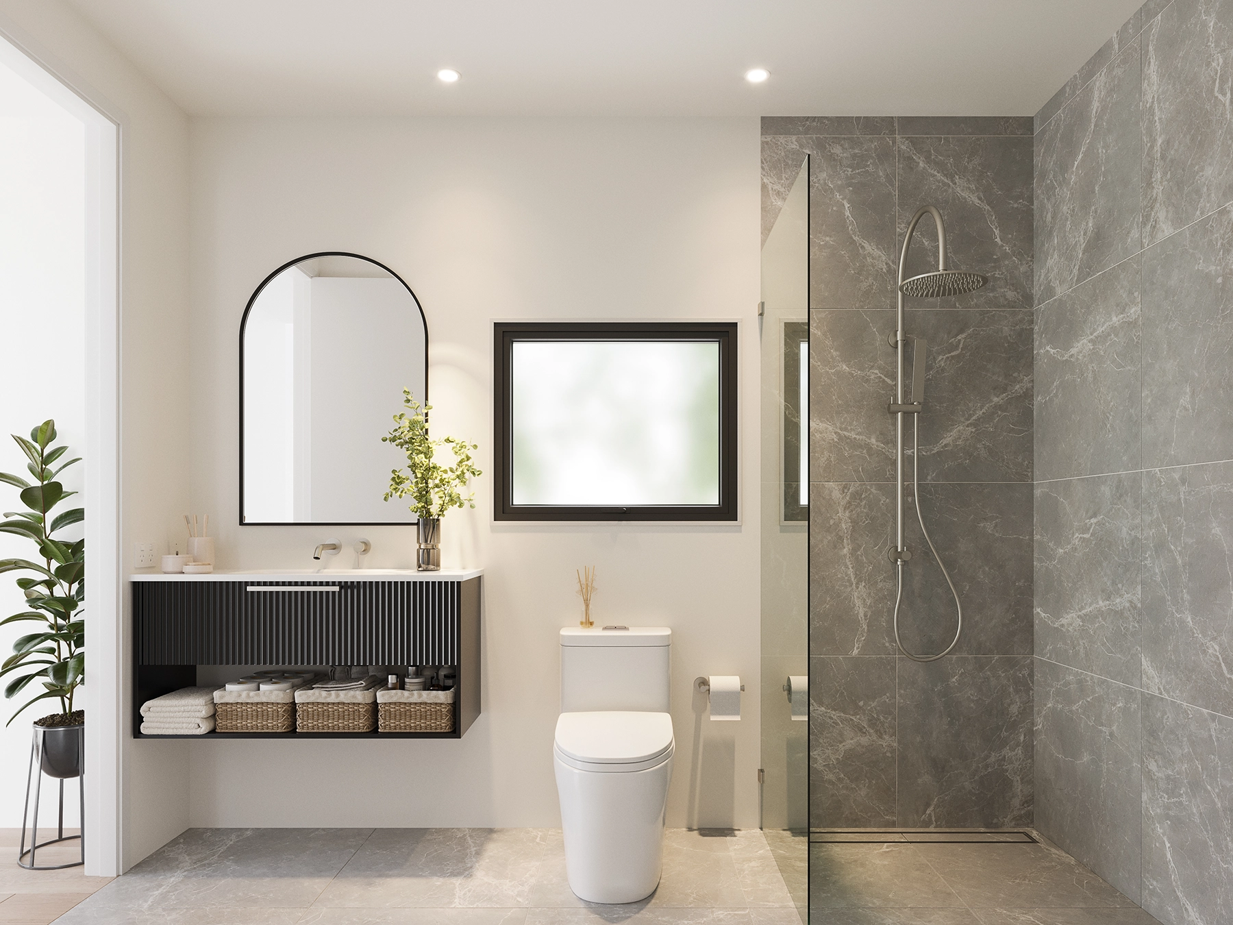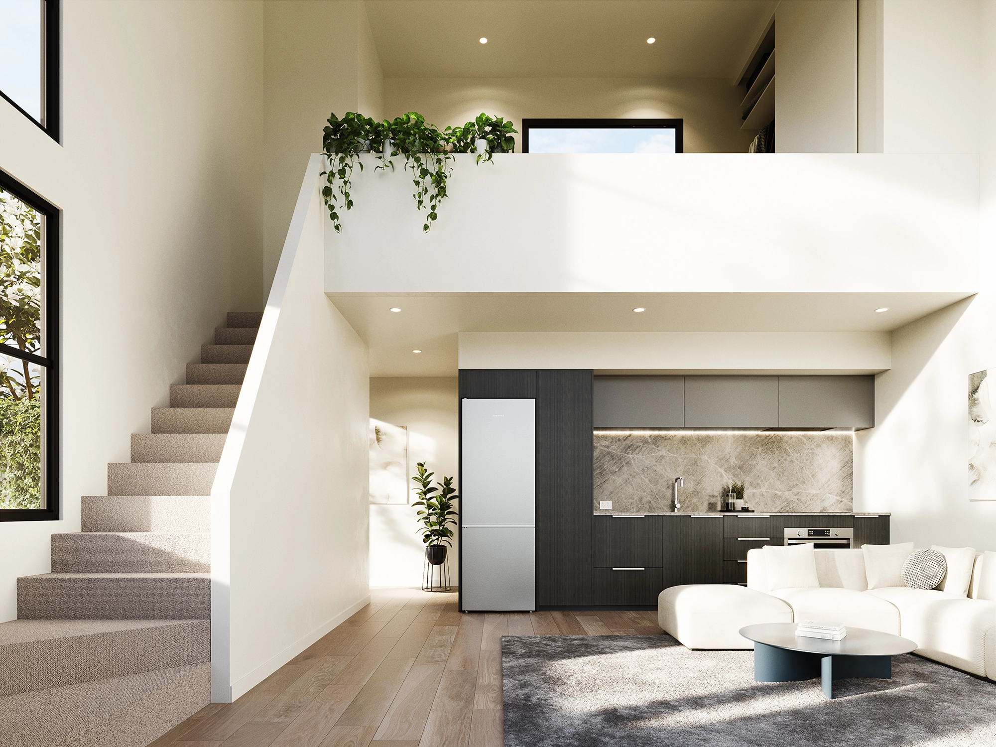 Moa Place explores density with individuality, offering a choice of spatial experiences within a cohesive architectural framework. The loft-style units deliver dramatic vertical volume and light, while the central homes prioritise intimacy and efficiency. Across all four, the textured grey plaster cladding creates a strong, refined street presence, setting the development apart from typical townhouse projects in Christchurch. Designed for flexibility, the homes respond equally well to investors, first-home buyers, and those seeking a lock-and-leave lifestyle at the centre of a vibrant, evolving city.