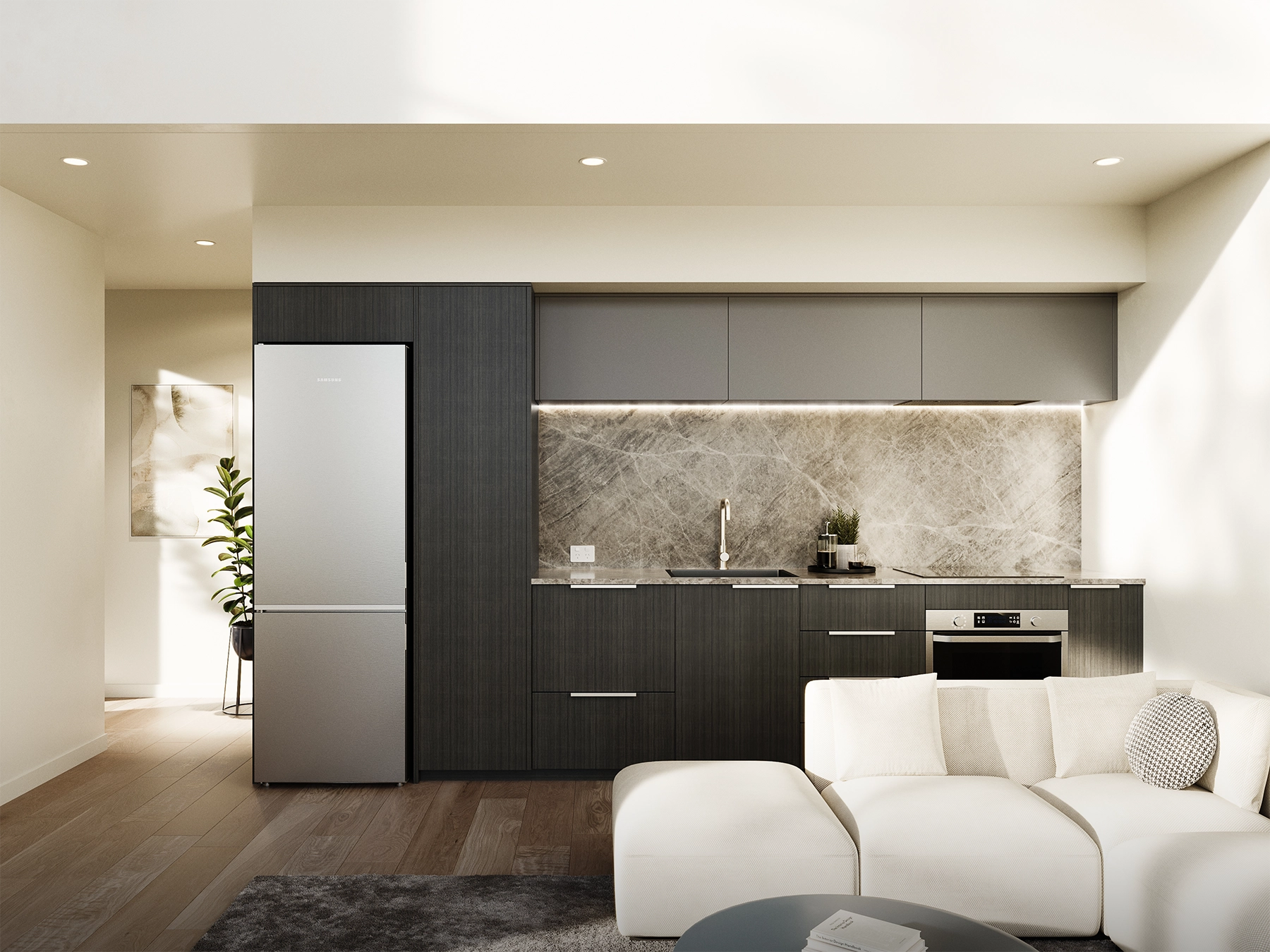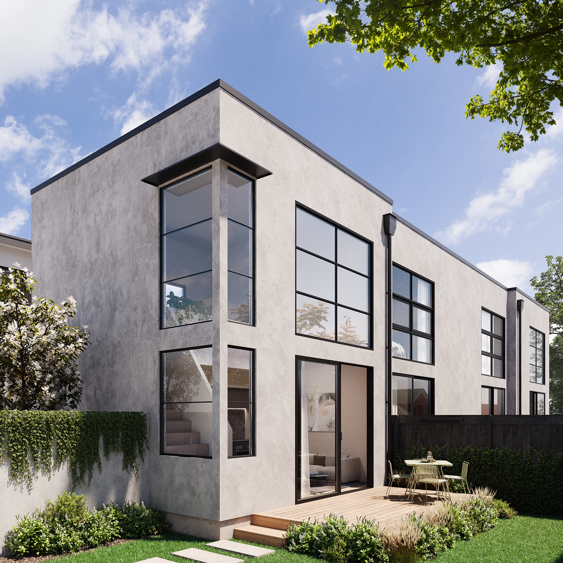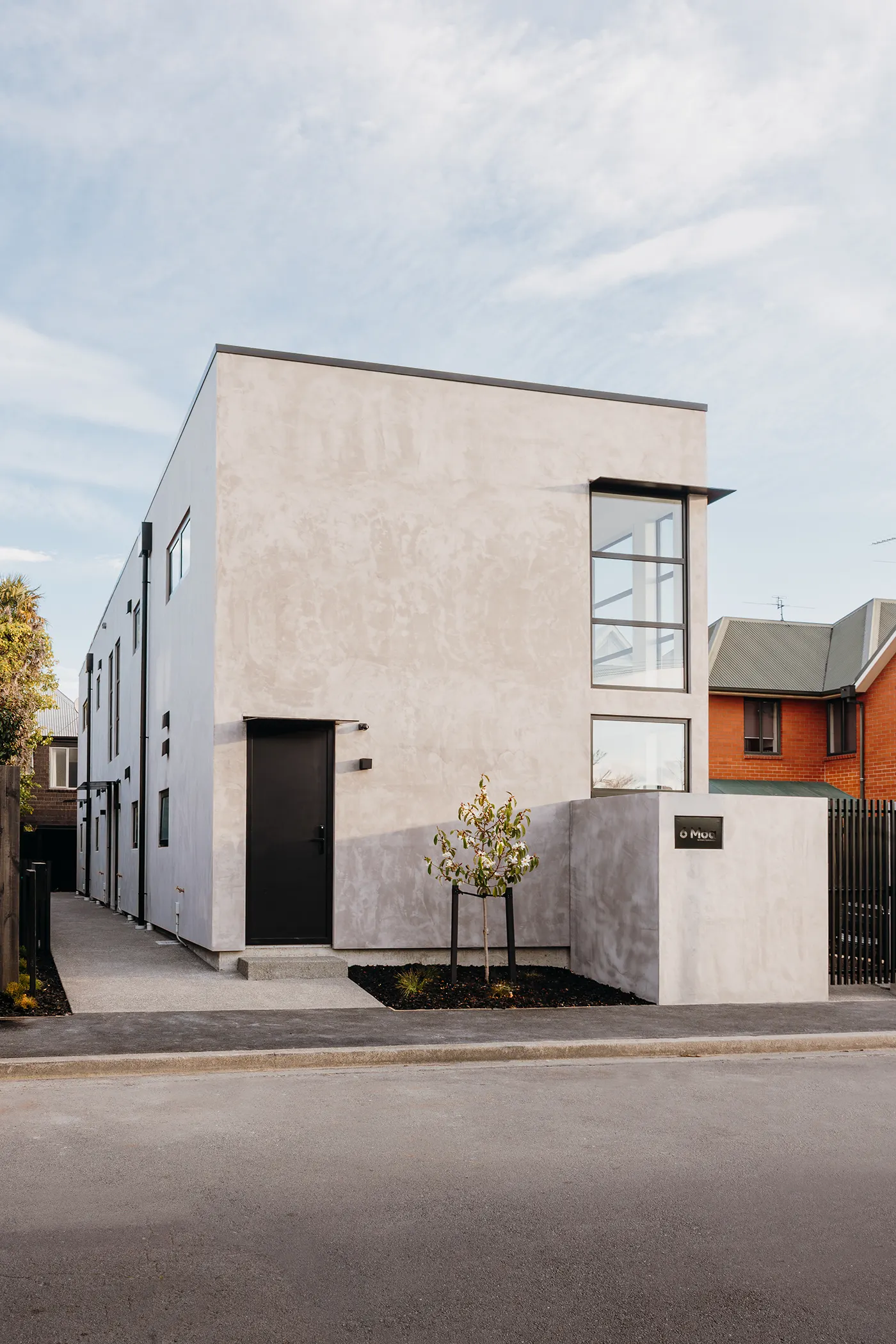 Captured on site, the finished Moa Place townhouses embody the clarity of the design vision. The exterior cladding — a distinctive cerano-finished grey plaster — reveals subtle tonal shifts under light and shadow, giving depth to the minimal forms. Courtyards create a strong connection between interior and exterior, while large glazing elements flood the interiors with light.